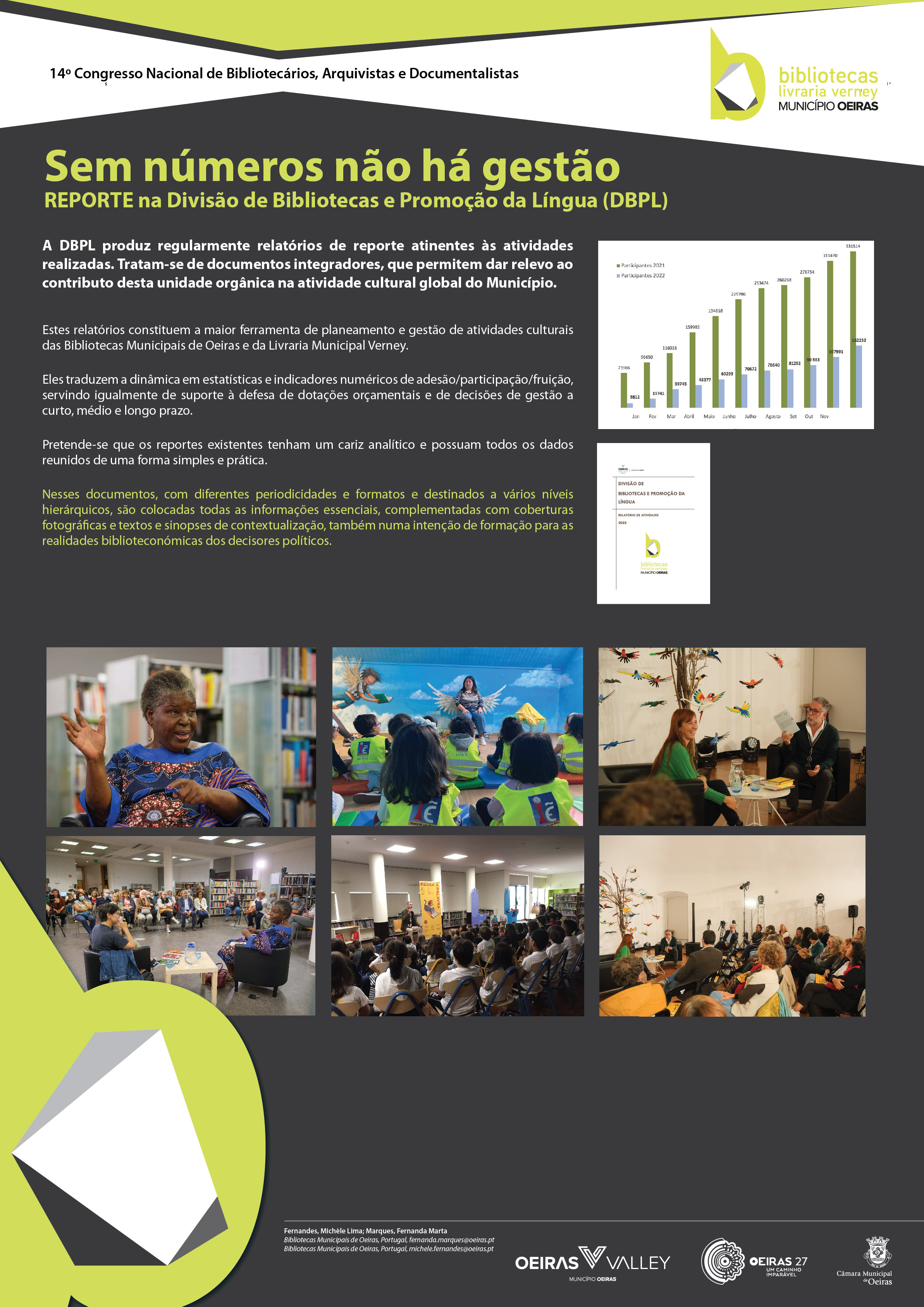A Divisão de Bibliotecas e Promoção da Língua (DBPL) produz regularmente relatórios de reporte atinentes às atividades realizadas. Trata-se de documentos integradores, que permitem dar relevo ao contributo desta unidade orgânica na atividade cultural global do Município. Estes relatórios constituem a maior ferramenta de planeamento e gestão de atividades culturais das Bibliotecas Municipais de Oeiras e da Livraria Municipal Verney, já que traduzem a dinâmica em estatísticas e indicadores numéricos de adesão/participação/fruição, servindo igualmente de suporte à defesa de dotações orçamentais e de decisões de gestão a curto, médio e longo prazo, ou seja, mais operacionais ou estratégicas; fornecem igualmente argumentos que permitem, para a opinião pública, transmitir a importância, impacto e relevância na comunidade.
